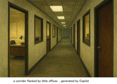 corridor flanked by little officesを「小さなオフィスのならぶ廊下」としているけど、flankedの訳し方が十分でない。これだと廊下の片側のみに little officesが並んでいると想像するけれど、実際には廊下の「両側」。